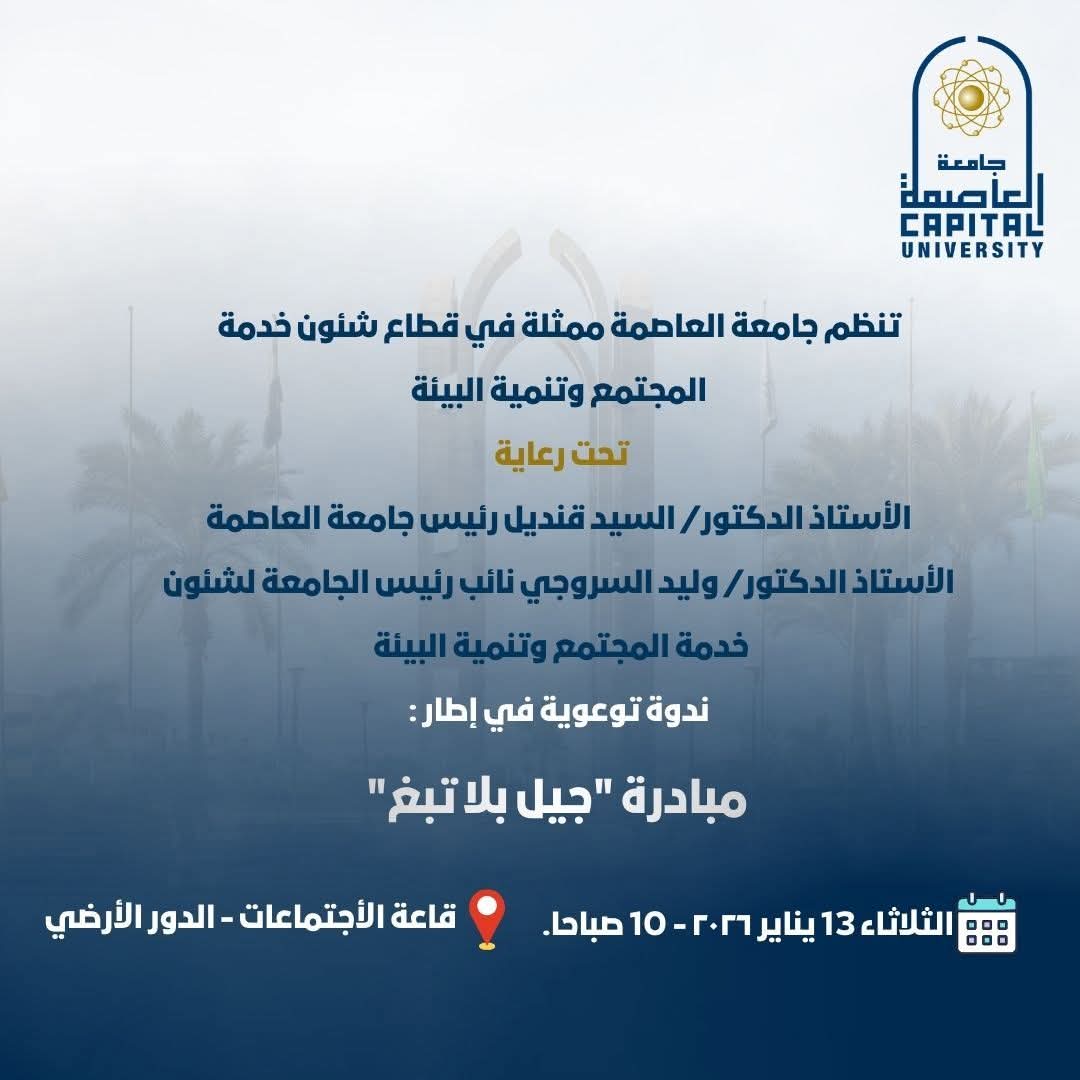 ندوة توعوية عن مخاطر التدخين بجامعة العاصمة كتب : احمد سلامة أعلنت جامعة العاصمة في إطار مبادرة "جيل بلا تبغ"، عن تنظيم ندوة توعوية للإداريين والعاملين بالجامعة حول المخاطر الصحية والاجتماعية للتدخين، وذلك يوم الثلاثاء الموافق 13 يناير 2026 في تمام الساعة العاشرة صباحاً، بقاعة اجتماعات العلاقات العامة